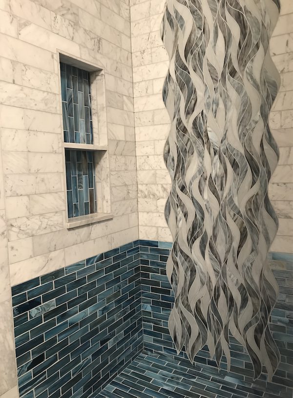 These back to back bathrooms have waterfalls and sunrise designs in the tile work. We enjoy having opportunities to be creative and draw on nature for inspiration.